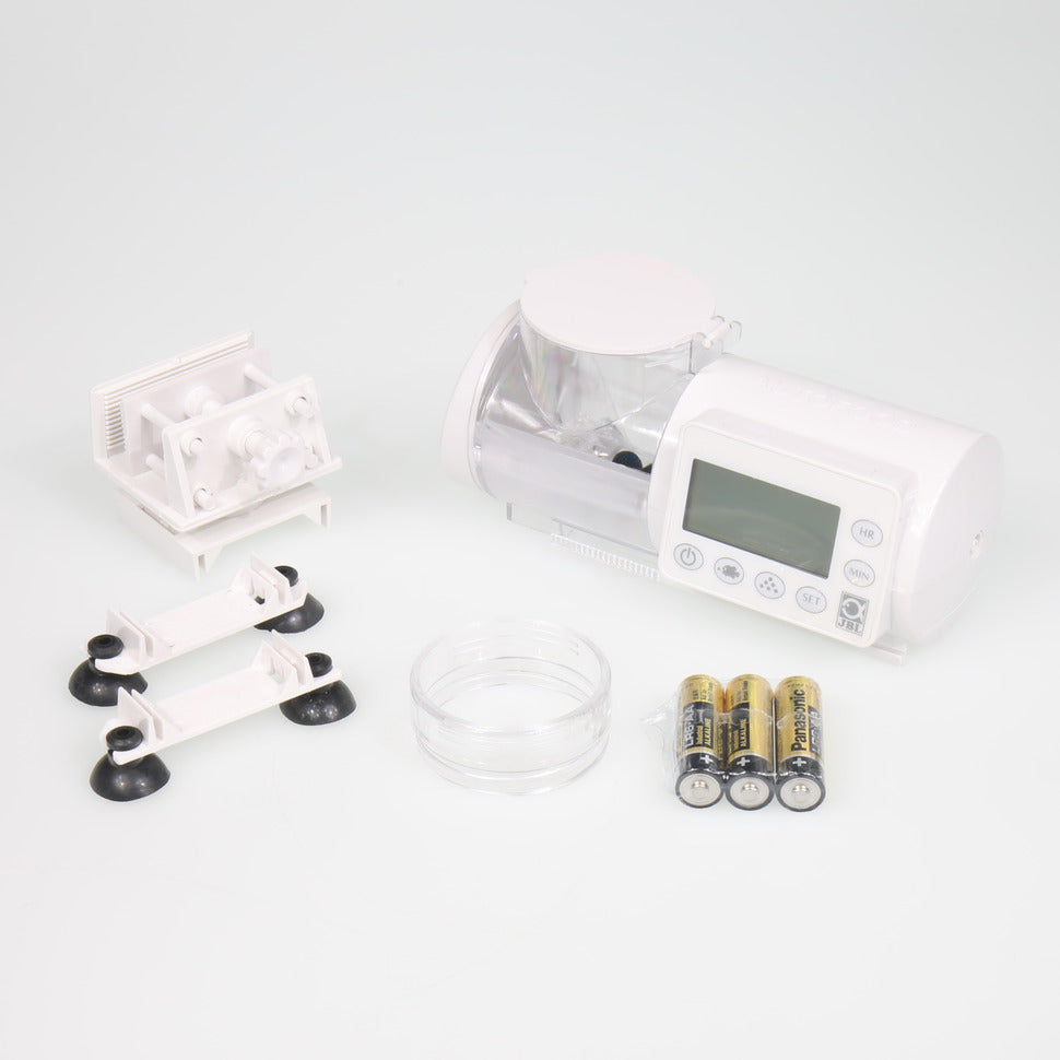 Pakkauksen sisältö: automaattinen ruokinta-annostelija akvaariokaloille, kiinnikkeet, 3 x 1,5 V AA-paristoa sekä adapterirengas 250 ml JBL PRONOVO -purkkeihin.